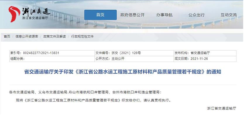 近日,浙江省交通運輸廳制定出臺《浙江省公路水運工程施工原材料和產品質量管理若干規定》(以下簡稱《若干規定》)。