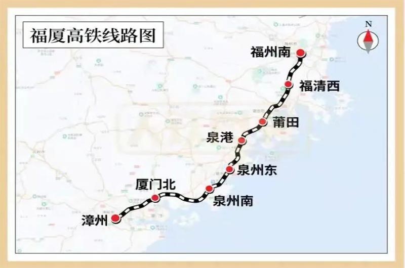 福廈高鐵線路北起福州市,南至廈門和漳州市,全長277.42公里,設(shè)計時速350公里,共設(shè)福州南、福清西、莆田、泉港、泉州東、泉州南、廈門北、漳州8座車站。