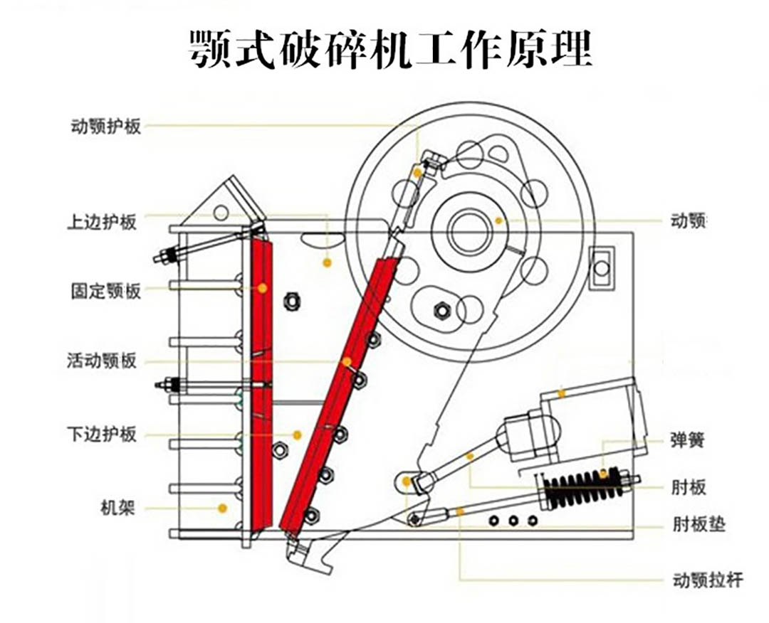 顎式破碎機由六大部分組成,分別為機架、傳動部分(電機、飛輪、皮帶輪、偏心軸)、破碎部分(動顎、動顎板、定顎板)、保險裝置(肘板、彈簧拉桿部)、調整部分、潤滑裝置。